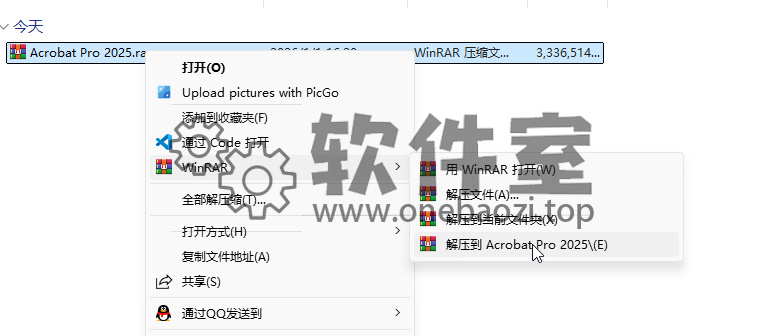- 解压安装包:找到并选择已下载好的压缩包,鼠标右键“解压到 Acrobat Pro 2025”。